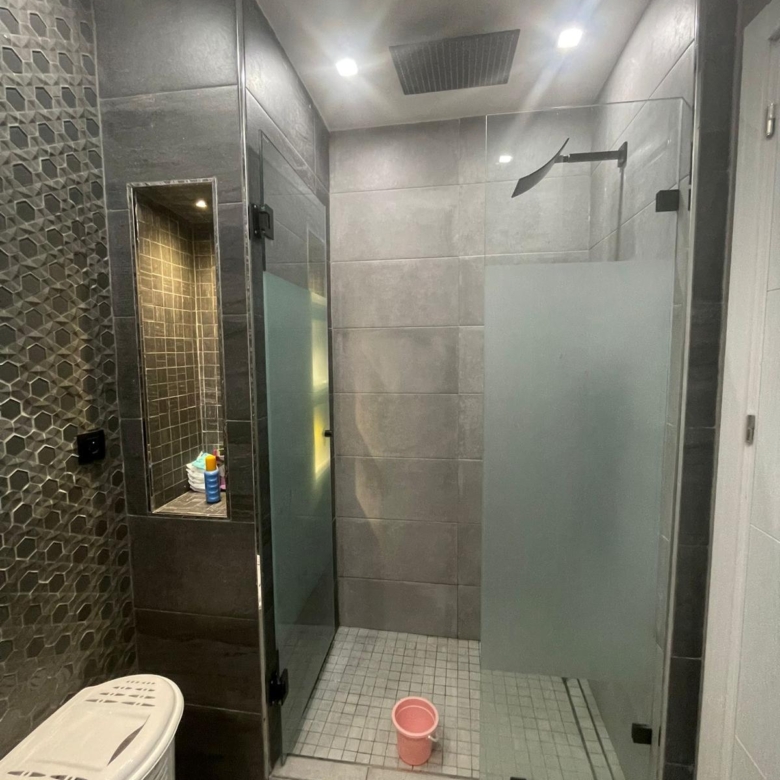 the apartment is styled in a modern European design, featuring built-in showers, contemporary bathrooms, a suspended ceiling, and elegant recessed lighting.